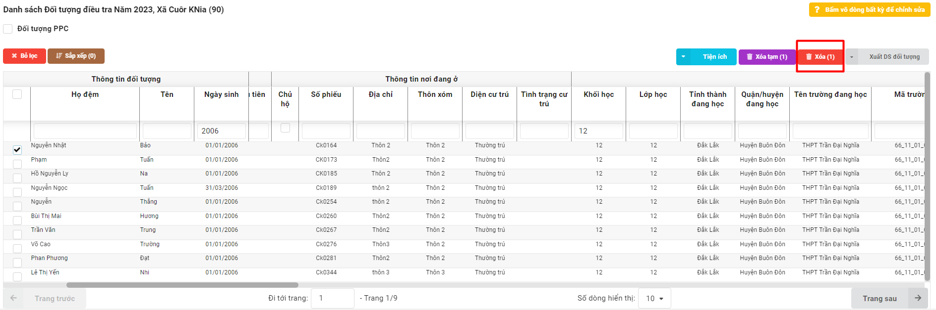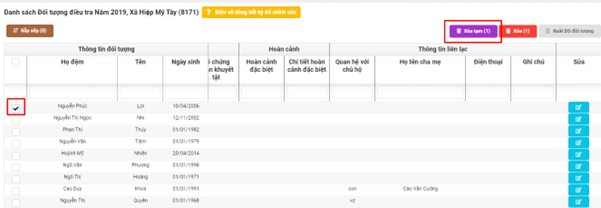 Thầy/Cô check chọn vào ô vuông phía trước cột “Họ đệm” của đối tượng muốn xóa tạm sau đó bấm nút Xóa tạm