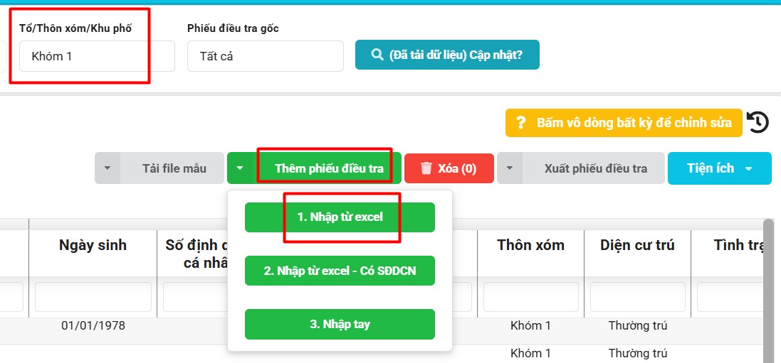 Để đưa file excel vào phần mềm, Thầy/Cô vào Danh sách phiếu điều tra => chọn Thôn/Ấp => Bấm nút Thêm phiếu điều tra => bấm nút Nhập từ excel