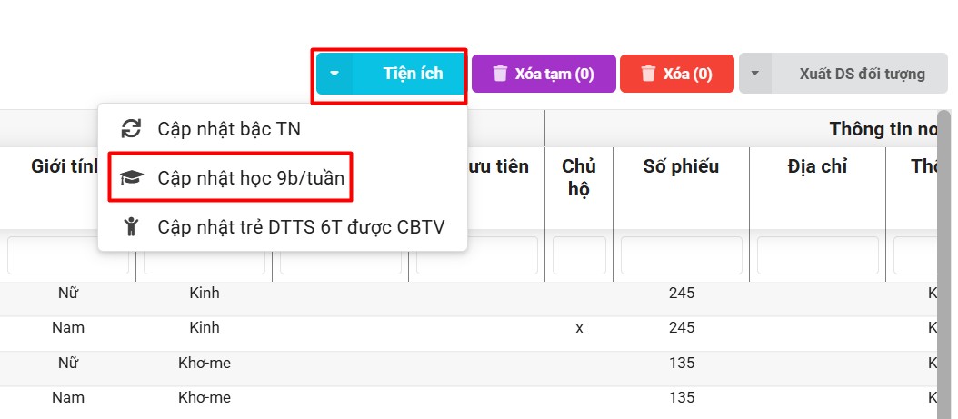 Bước 2: Bấm nút Cập nhật học 9b/tuần