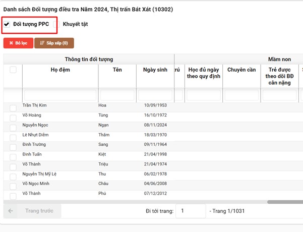 Trong quá trình lọc tìm đối tượng thì Thầy/Cô có thể check vào ô Đối tượng PPC để loại bỏ những đối tượng khuyết tật, chuyển đi.