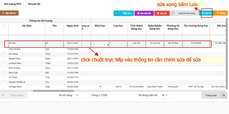 Bấm vào thông tin cần chỉnh sửa của đối tượng, chỉnh sửa sau đó bấm nút Lưu