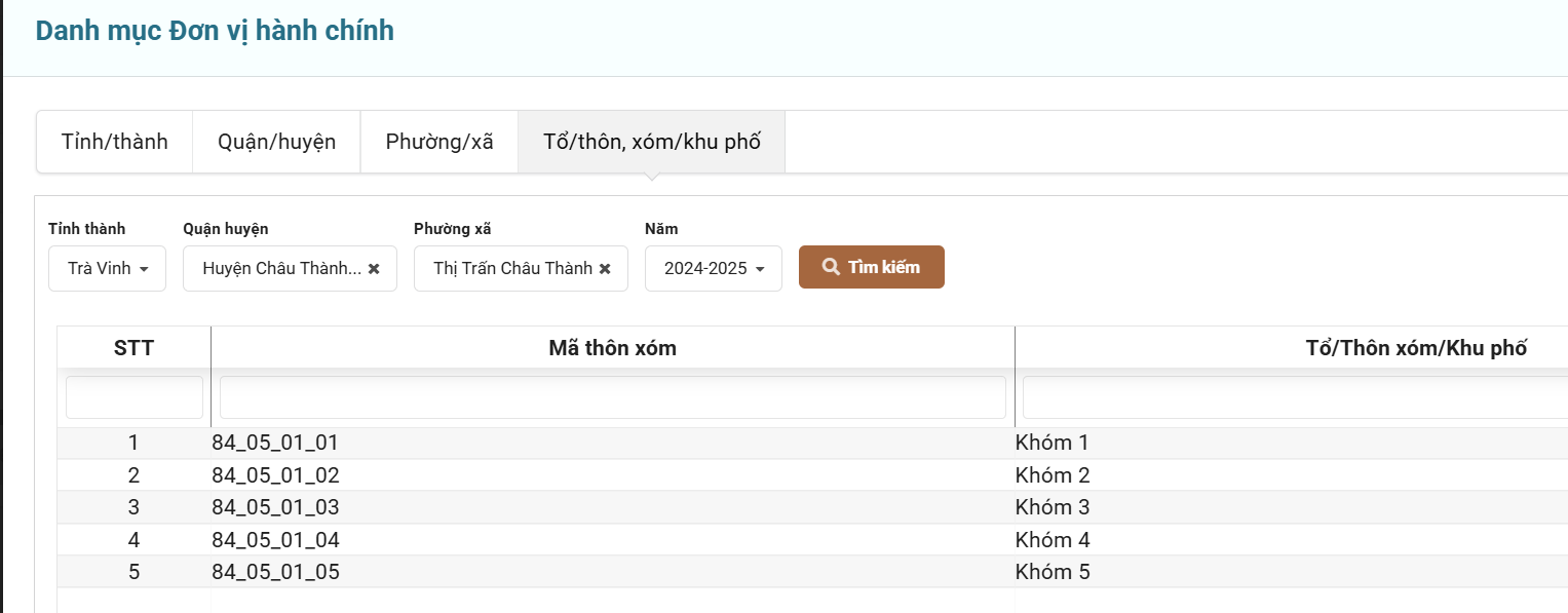 - Ở giao diện này, Thầy/Cô có thể chọn Tỉnh/Thành, Phường/Xã, Thôn/Tổ để xem danh sách.