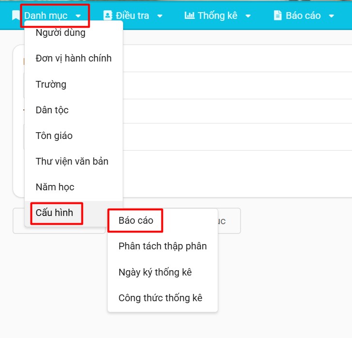 Bên cạnh cấu hình danh sách báo cáo và công thức thống kê, Thầy/Cô cũng có thể cấu hình ngày ký thống kê và phân tách thập phân. Thầy/Cô vui lòng xem chi tiết hướng dẫn tại mục Quản trị > Cấu hình, hoặc nhấp vào đường link bên dưới.
