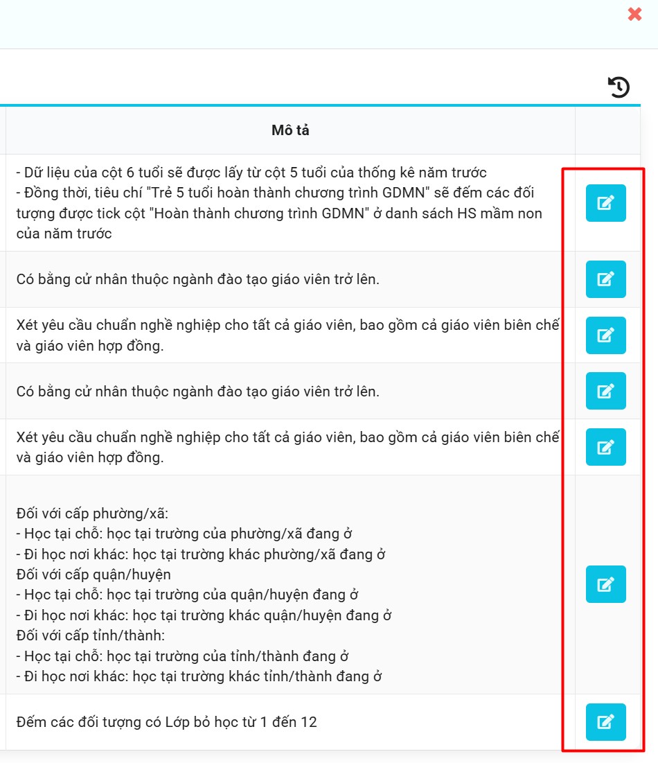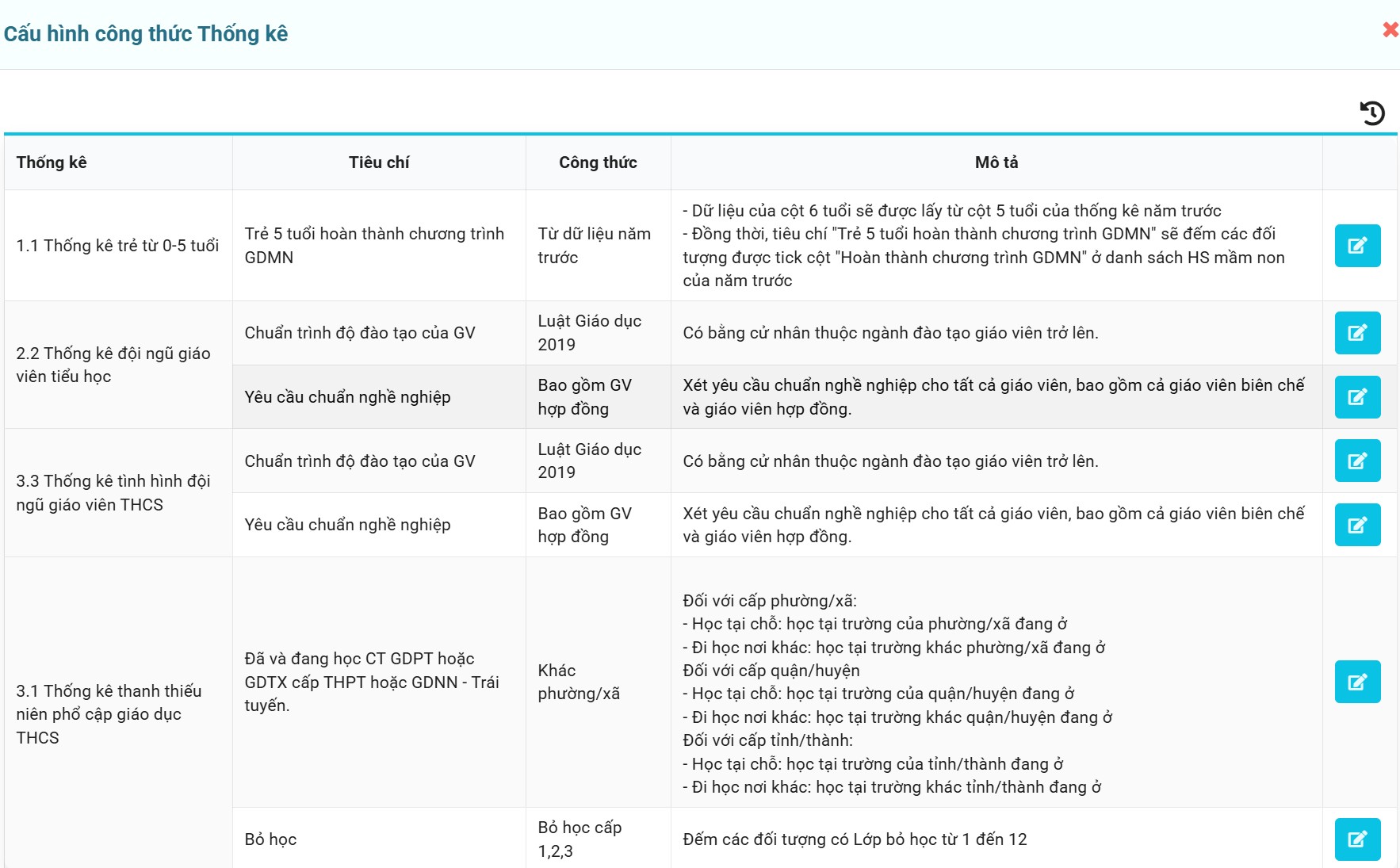 Mục đích: Tùy chỉnh công thức thống kê riêng cho từng mẫu theo nhu cầu của đơn vị. Tính năng này chỉ dành cho Sở, các cấp khác chỉ xem.