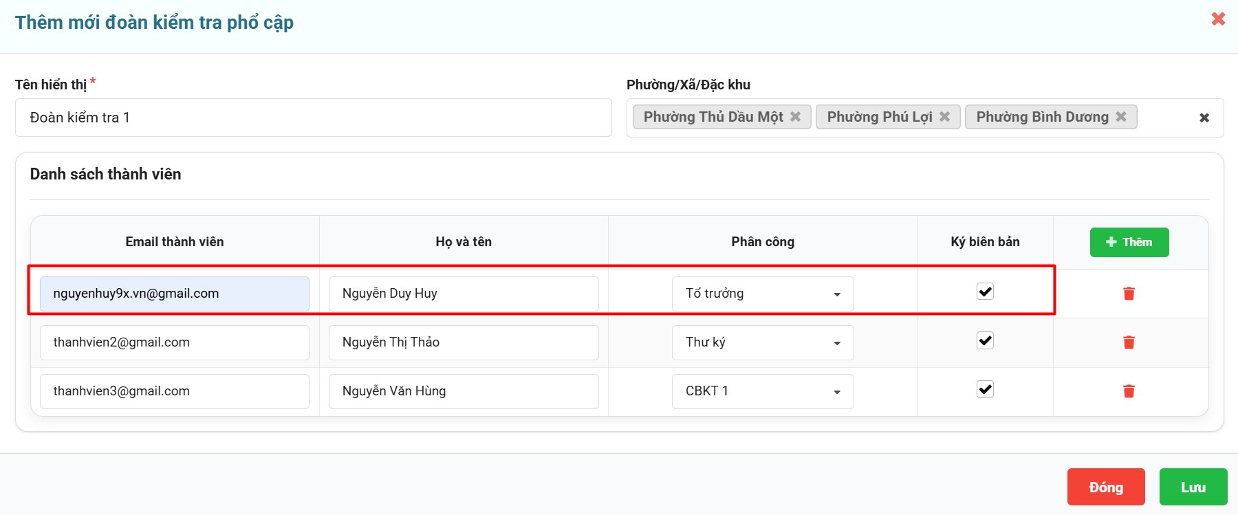- Phân công: chọn các nhiệm vụ tương ứng: trưởng đoàn, thư ký, CBKT 1, CBKT 2, CBKT 3