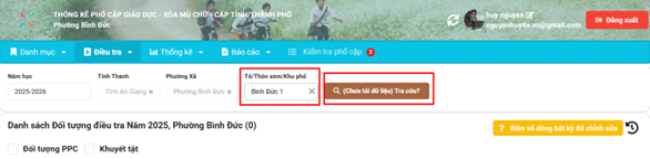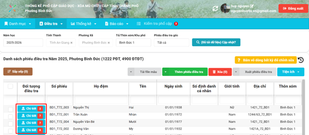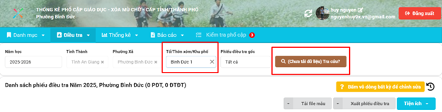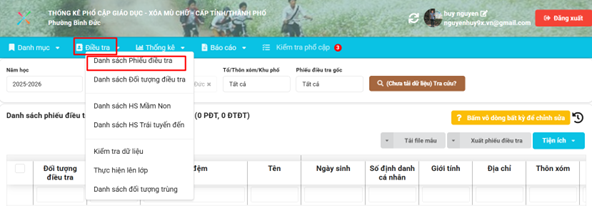 Bước 1: Vào điều tra -> danh sách phiếu điều tra