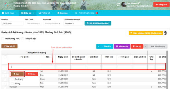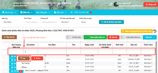 Bước 3: Có thể lọc tìm nhanh hộ gia đình bằng cách nhập thông tin rồi bấm lọc