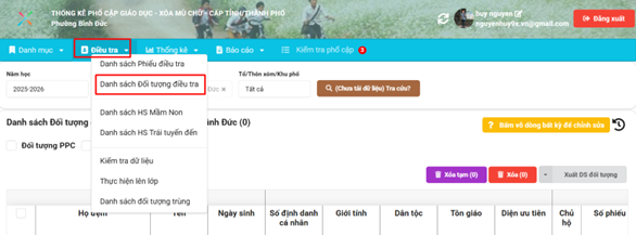 Bước 1: Vào điều tra -> danh sách đối tượng điều tra.
