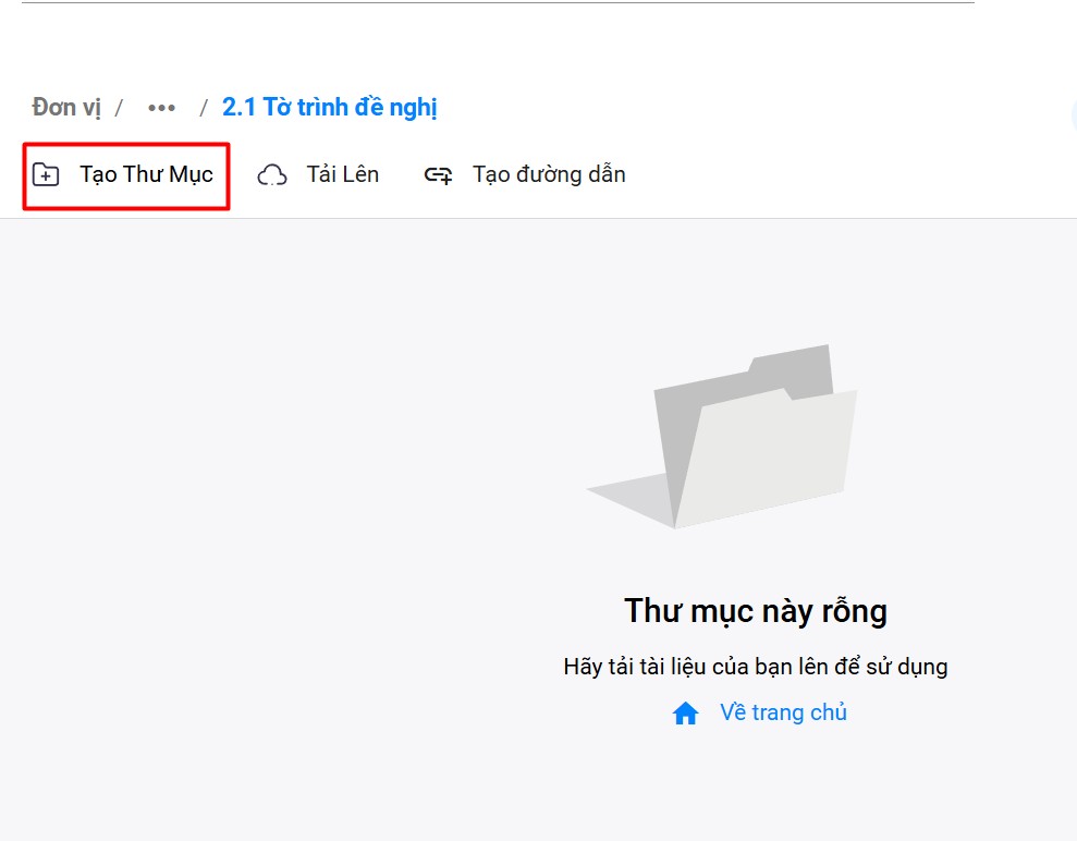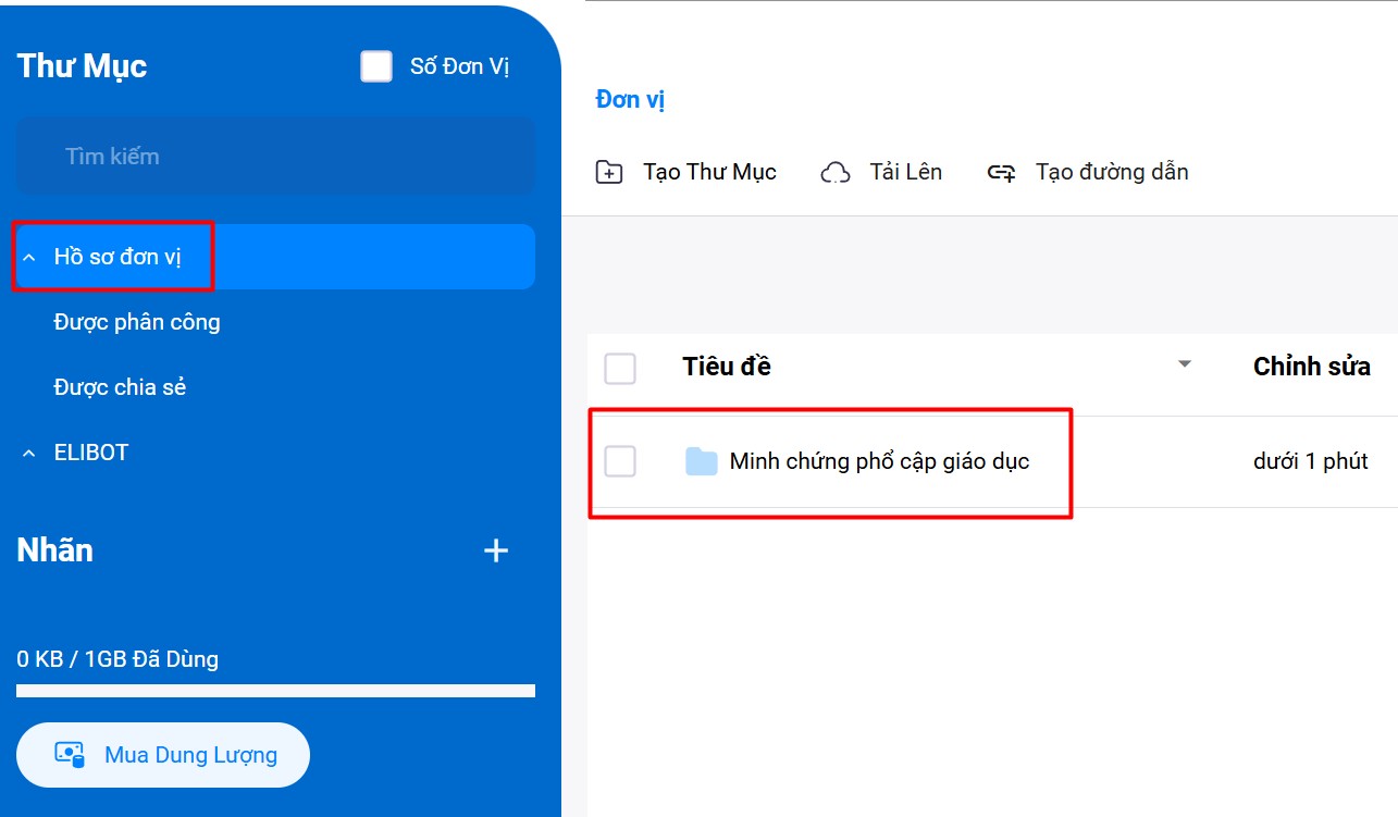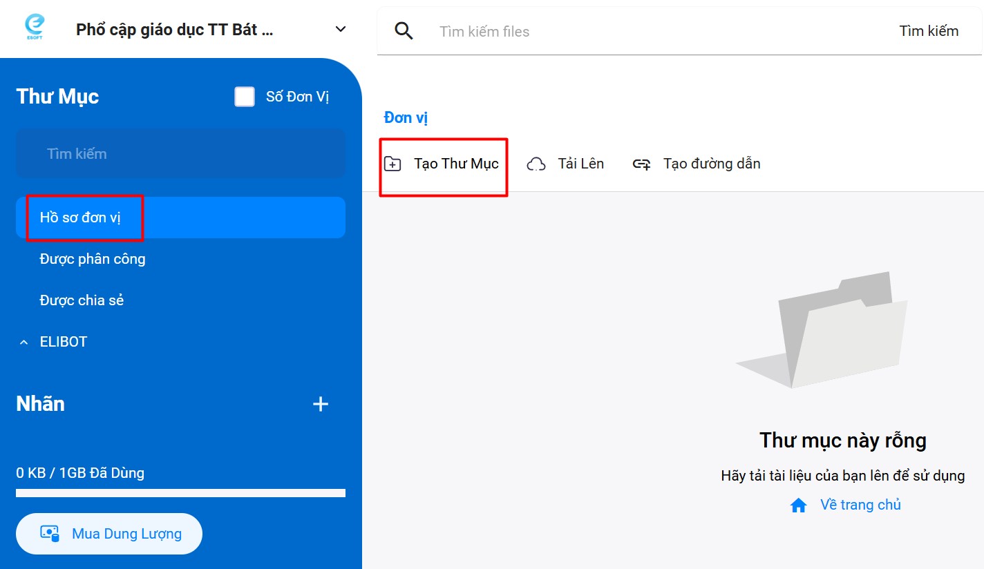 Bước 1: Bấm vào Hồ sơ đơn vị => Bấm nút Tạo thư mục