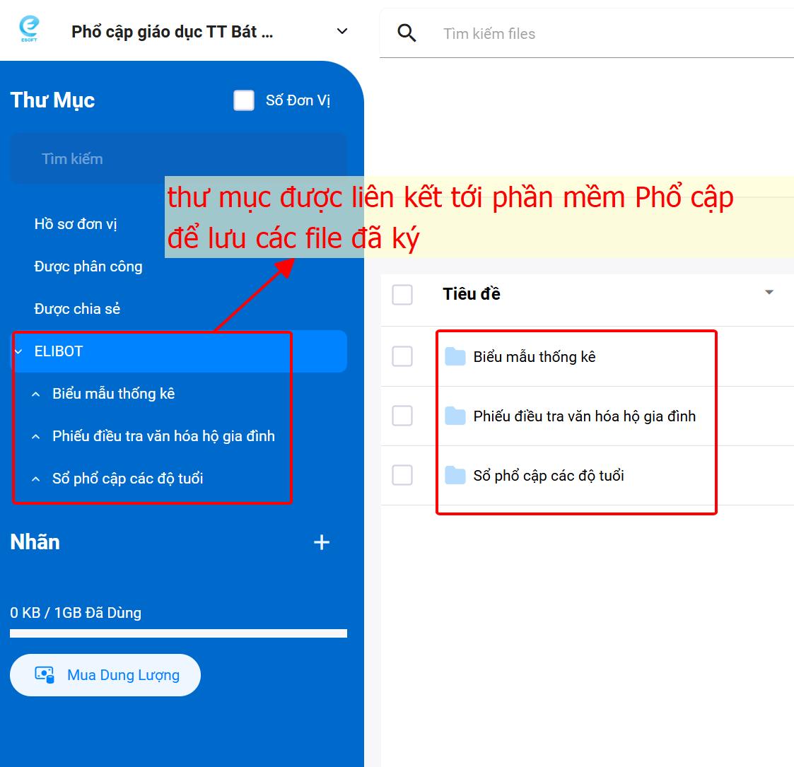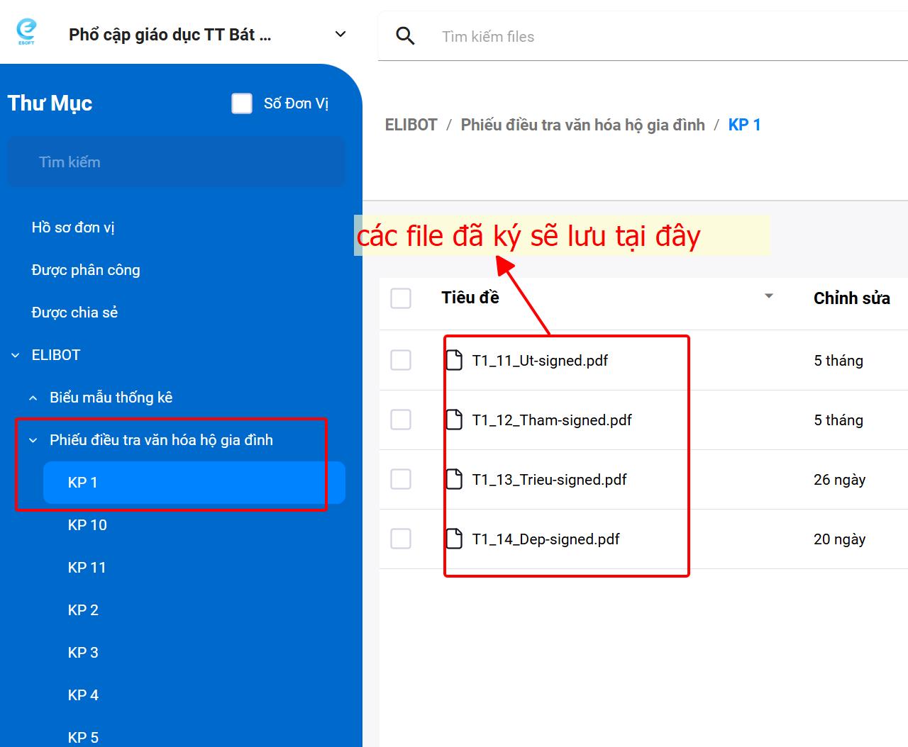 Bước 3: Bên trái sẽ có thư mục tên ELIBOT. Trong thư mục này sẽ có các thư mục con: Biểu mẫu thống kê, Phiếu điều tra văn hóa hộ gia đình, Sổ phổ cập các độ tuổi. Các phiếu điều tra, thống kê đã ký ở phần mềm Phổ cập sẽ tự động lưu vào đây.