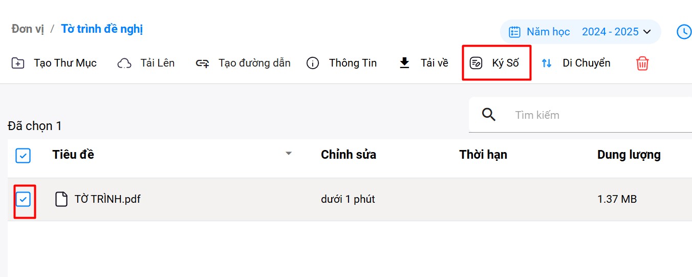 Check vào ô vuông phía trước file sau đó bấm nút Ký số