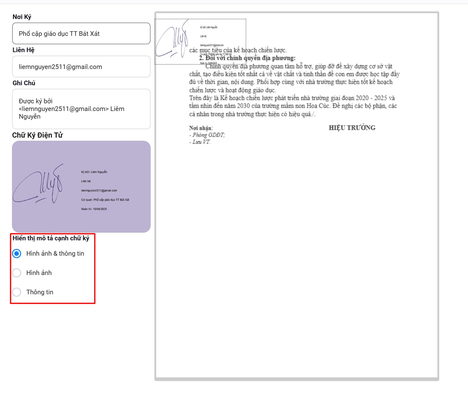 - Hình ảnh & thông tin: hiển thị chữ ký và bên cạnh có thông tin của người ký như: email, đơn vị, ngày ký,… Mặc định phần mềm sẽ chọn sẵn loại này