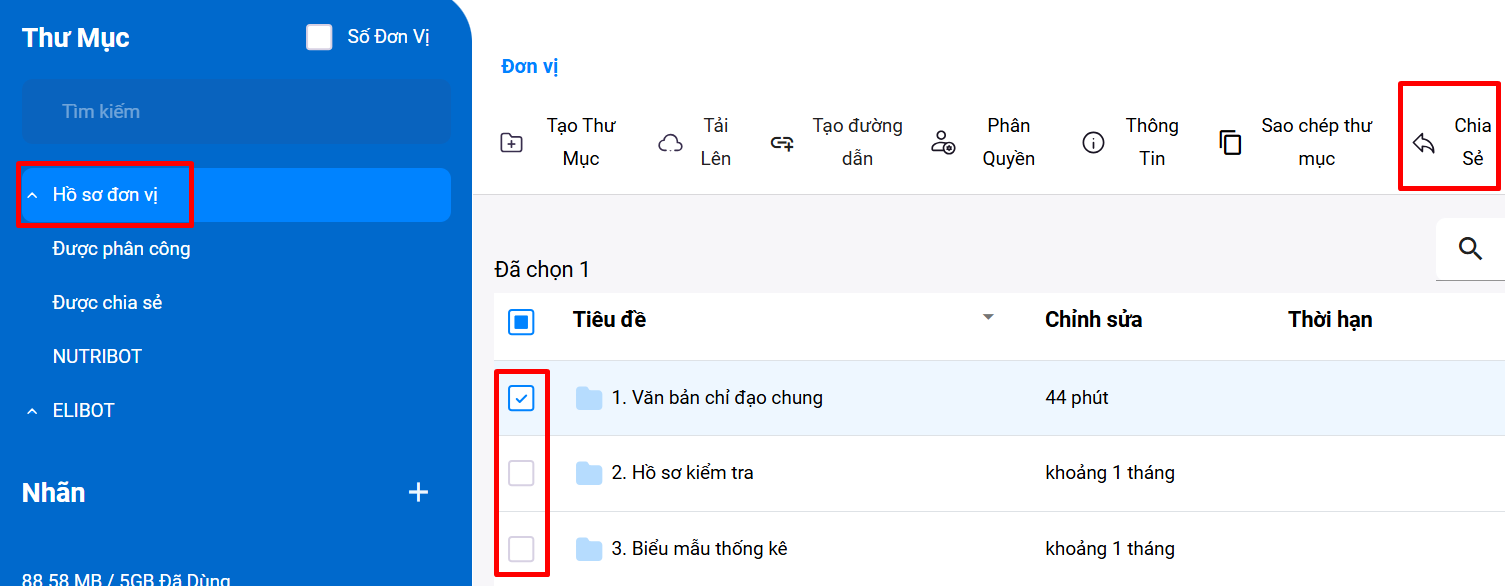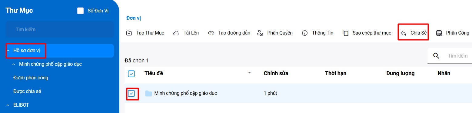 Bước 1: Tại mục Hồ sơ đơn vị, check vào ô vuông phía trước thư mục muốn chia sẻ sau đó bấm nút Chia sẻ
