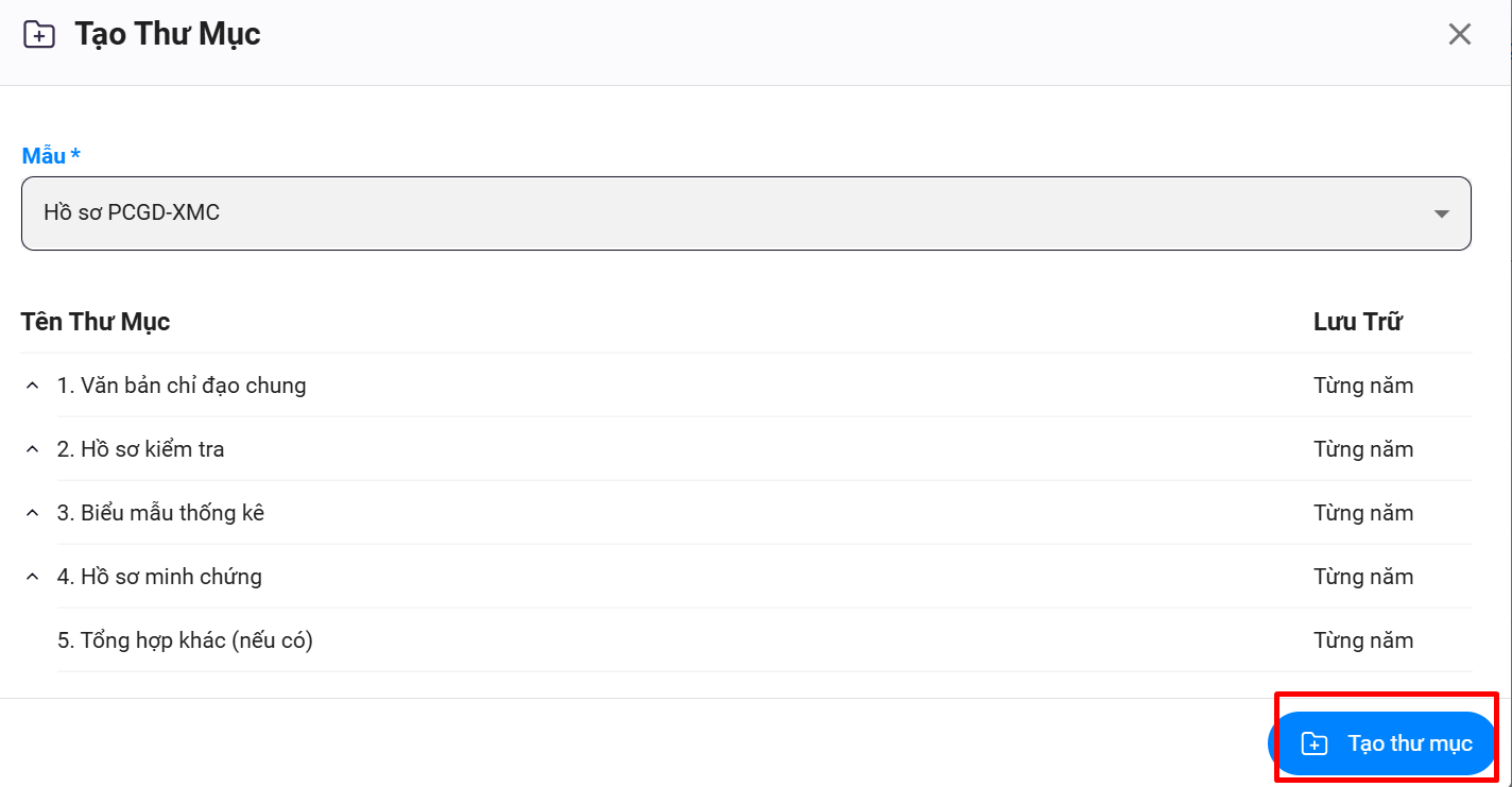 - Thầy/Cô thể thêm mới thư mục ngoài thư mục có sẵn bằng cách bấm nút Tạo thư mục