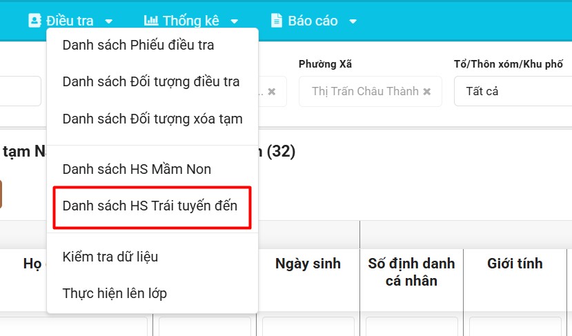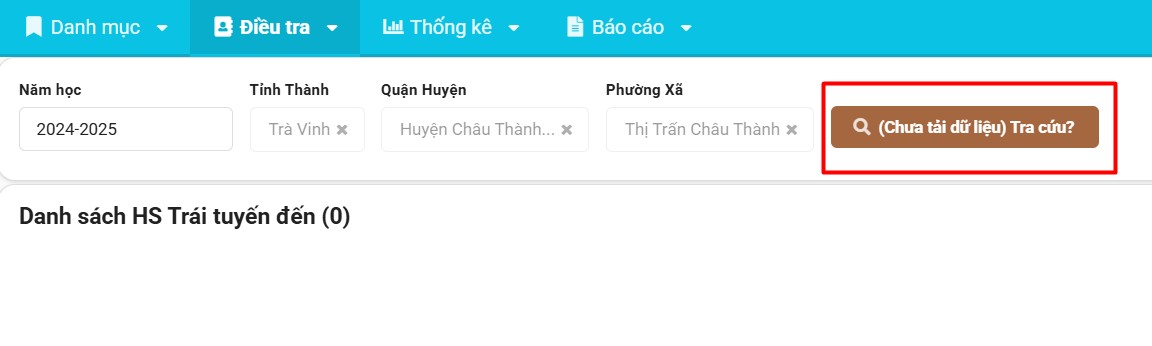 Bước 1: Vào menu Điều tra => Danh sách học sinh trái tuyến đến