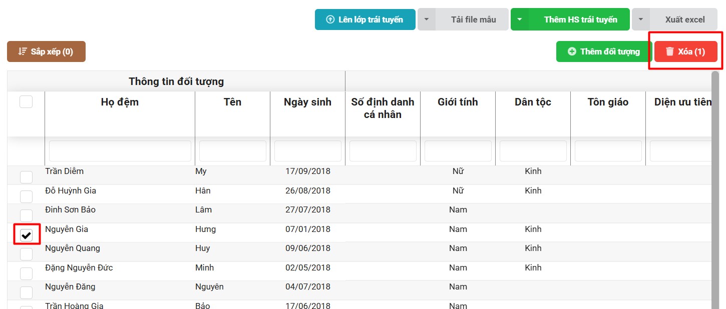 Sau khi nhập file excel vào phần mềm thành công sẽ hiện ra danh sách học sinh trái tuyến như hình dưới.