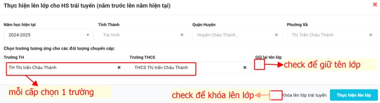 Giữ lại tên lớp(nếu cần) - Giữ lại tên lớp: Giữ lại đuôi phía sau của tên lớp. Ví dụ năm cũ nhập 6A1 khi lên lớp sẽ là 7A1 (giữ lại A1)