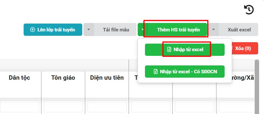 Bước 4: Đưa file excel vừa nhập vào phần mềm bằng cách bấm nút Thêm HS trái tuyến sau đó bấm nút Nhập từ excel