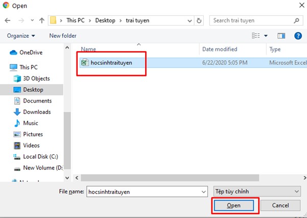 Bước 5: Chọn file excel đang lưu ở máy tính rồi bấm Open