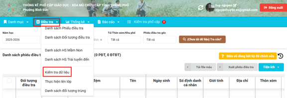Bước 1: Vào điều tra -> Kiểm tra dữ liệu