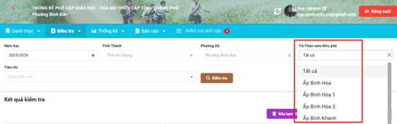 Bước 2: Chọn tổ/thôn xóm/khu phố cần kiểm tra hoặc chọn tất cả để kiểm tra toàn phường xã.