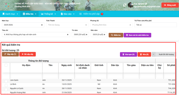 Mục đích: hỗ trợ kiểm tra dữ liệu phiếu điều tra và đối tượng điều tra ở phường xã đã được nhập đúng hay chưa.
