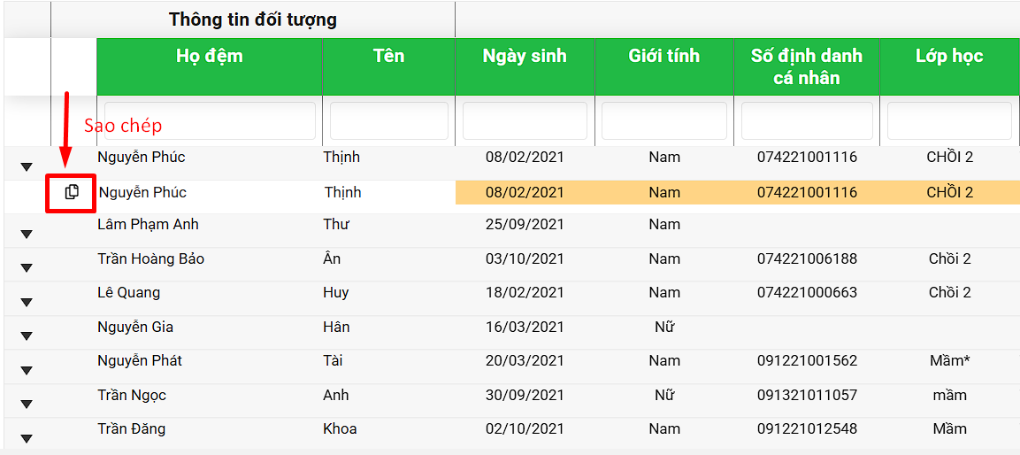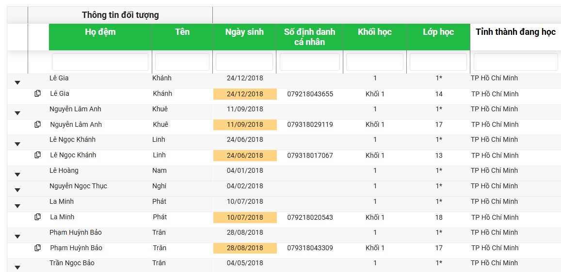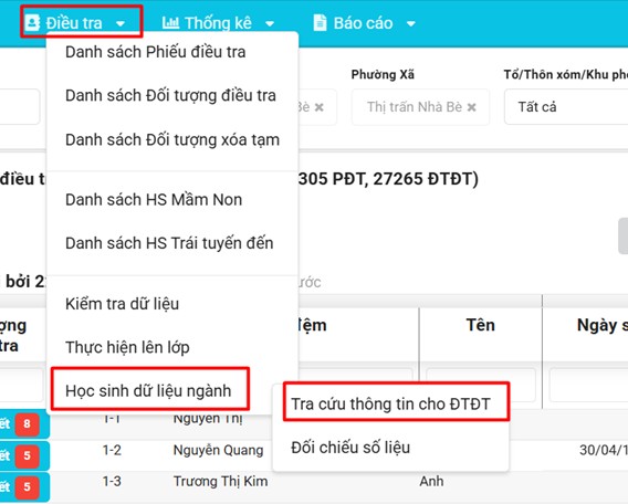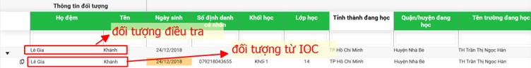 Bước 6: Đối tượng có dấu mũi tên bên cạnh là đối tượng từ hệ thống phổ cập (đối tượng điều tra), đối tượng ở bên dưới là đối tượng trả về từ CSDL ngành (nếu có)